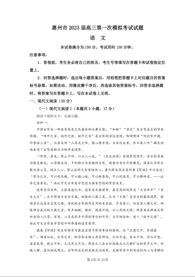 高三语文(解析版)--广东省惠州市2023届高考一模考试(惠州一模)