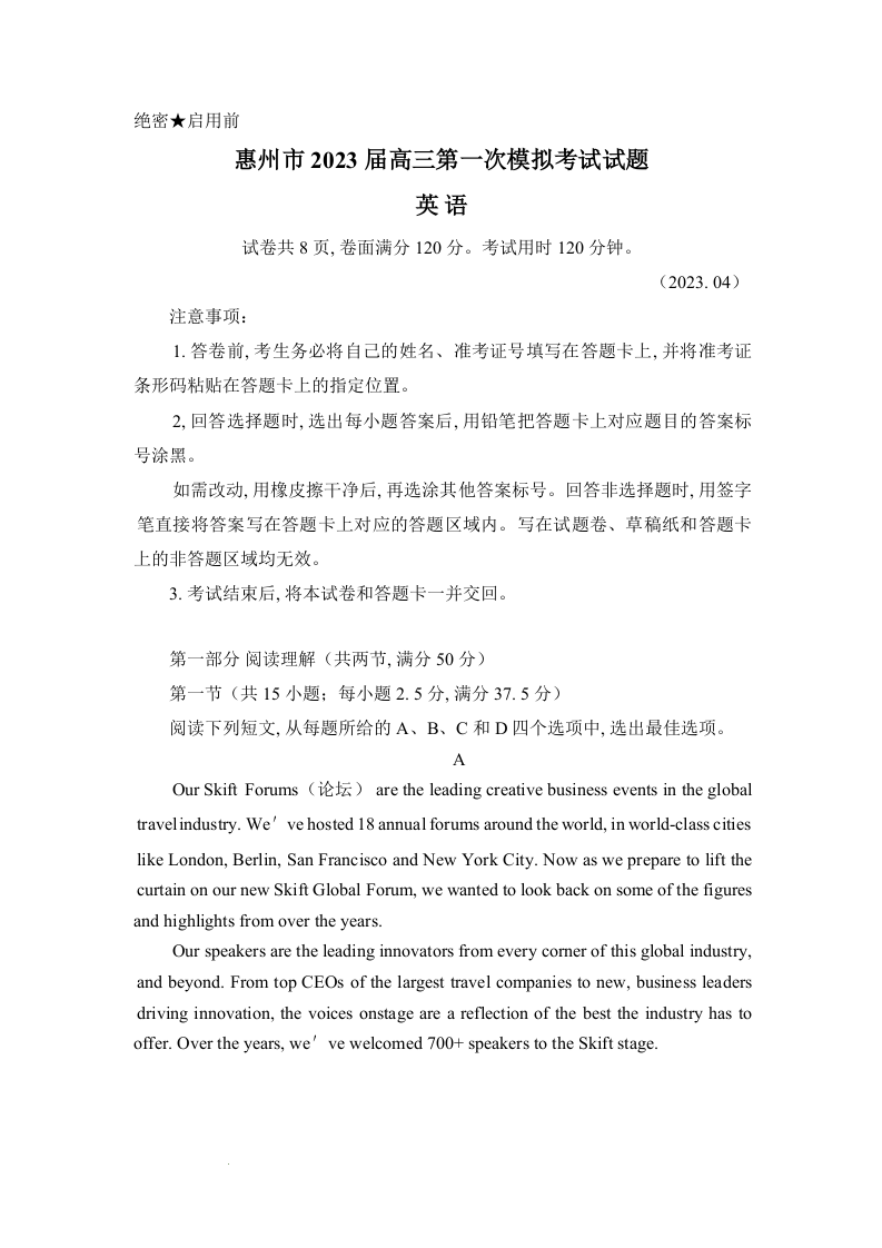 高三英语+答案--广东省惠州市2023届高考一模考试(惠州一模)