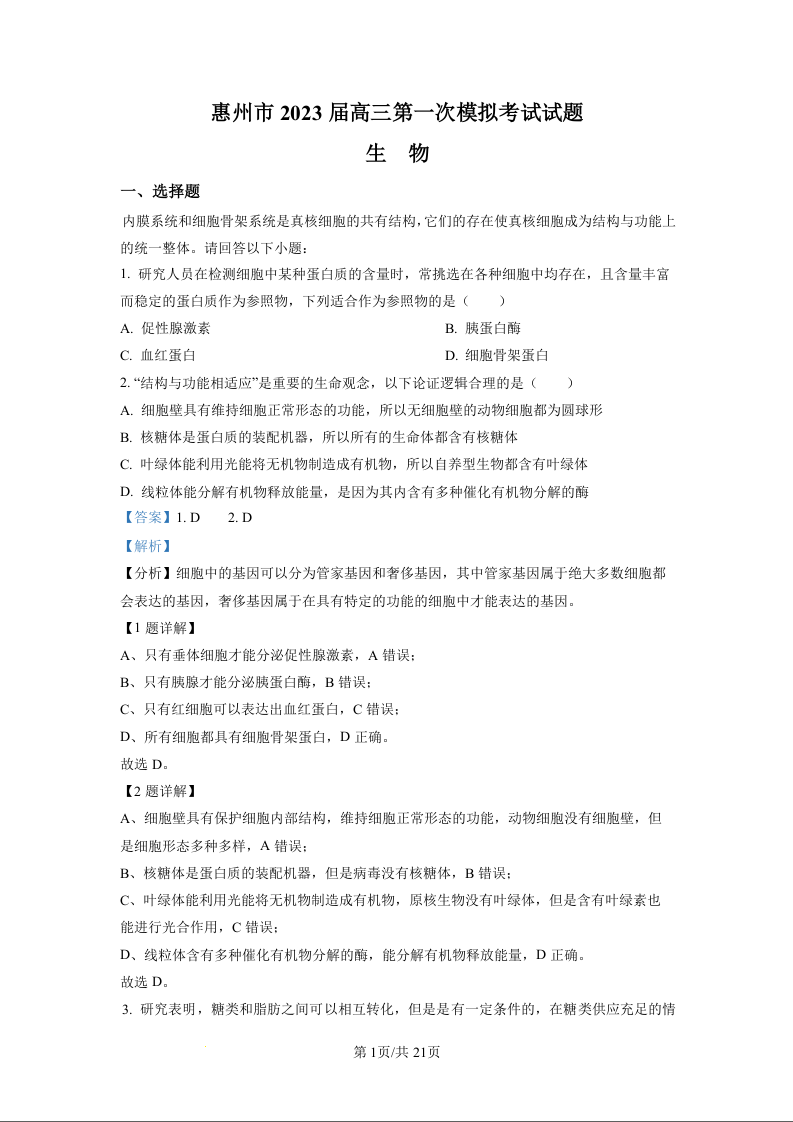 高三生物(解析版)--广东省惠州市2023届高考一模考试(惠州一模)