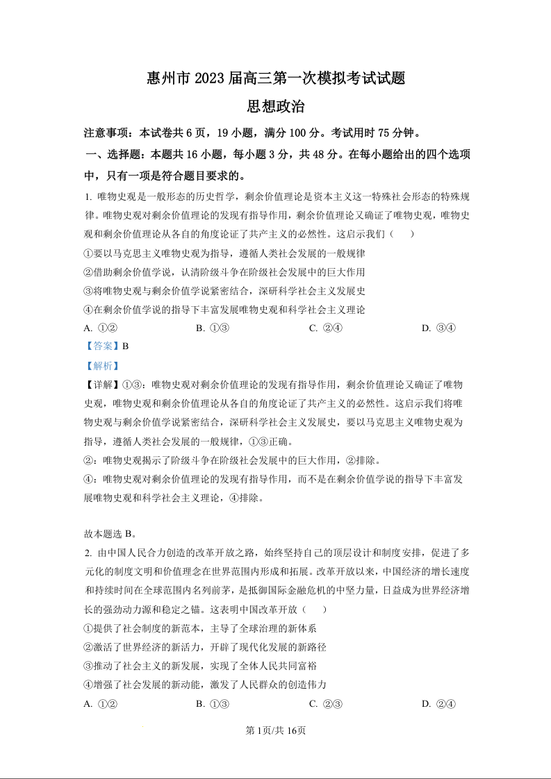 高三政治(精品解析版)--广东省惠州市2023届高考一模考试(惠州一模)