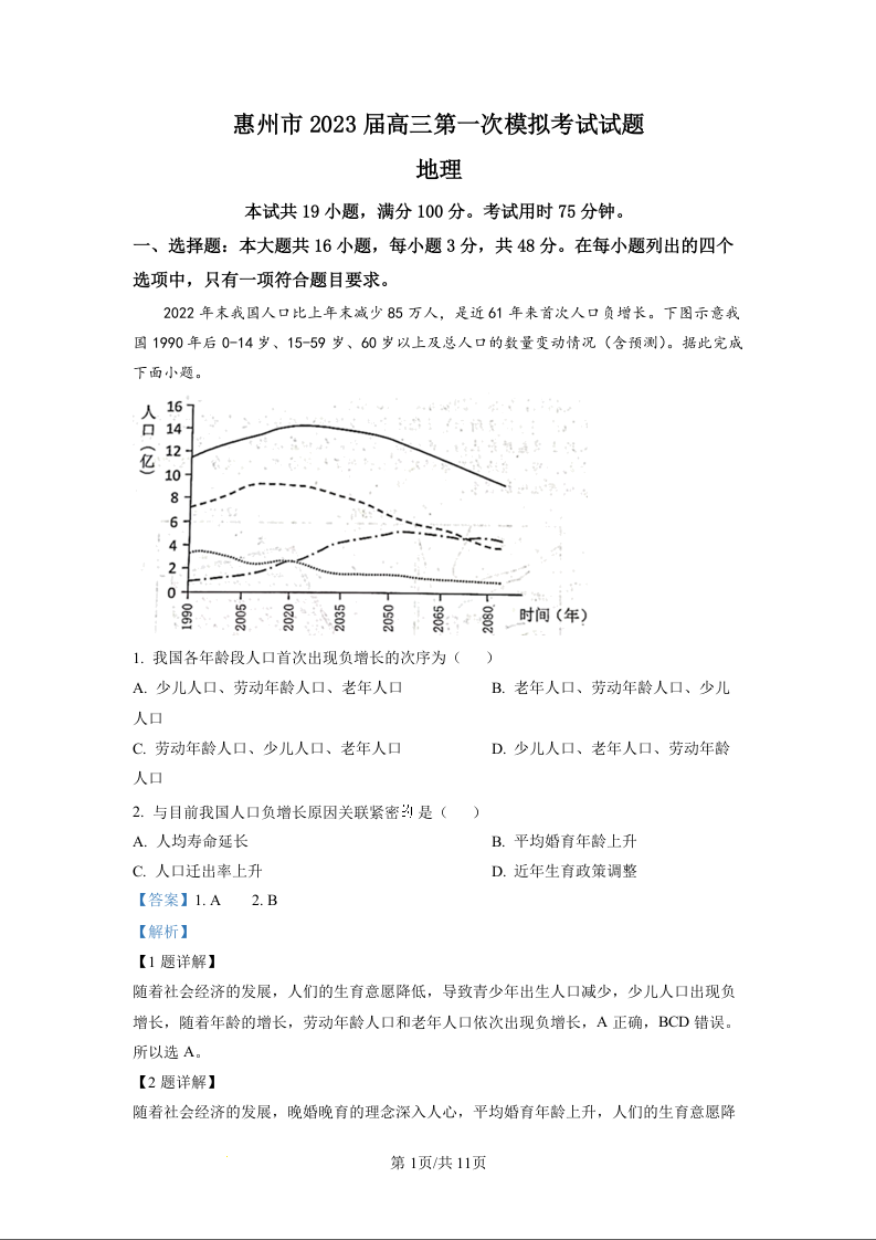 高三地理(精品解析版)--广东省惠州市2023届高考一模考试(惠州一模)