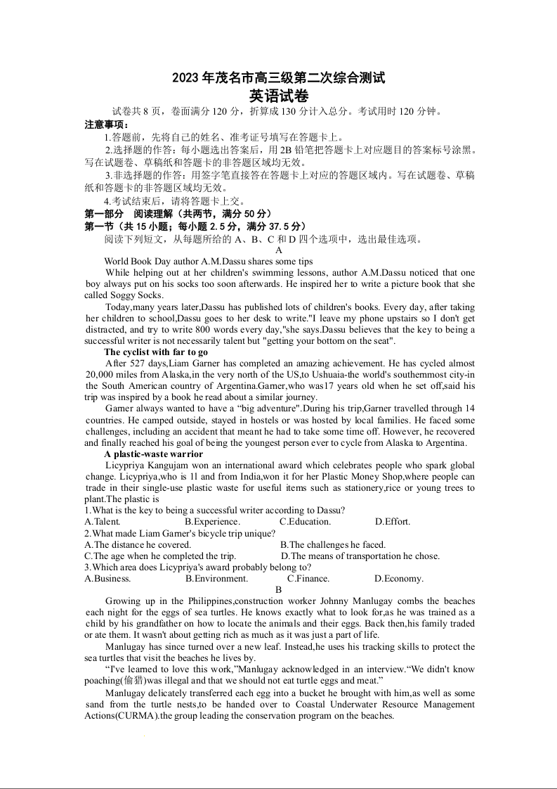 高三英语+答案--广东省茂名市2023届高三下学期第二次综合考试(二模)
