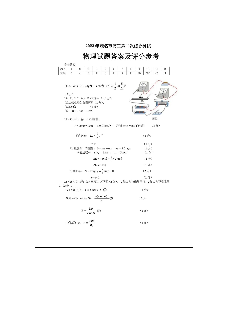 高三物理答案--广东省茂名市2023届高三下学期第二次综合考试(二模)