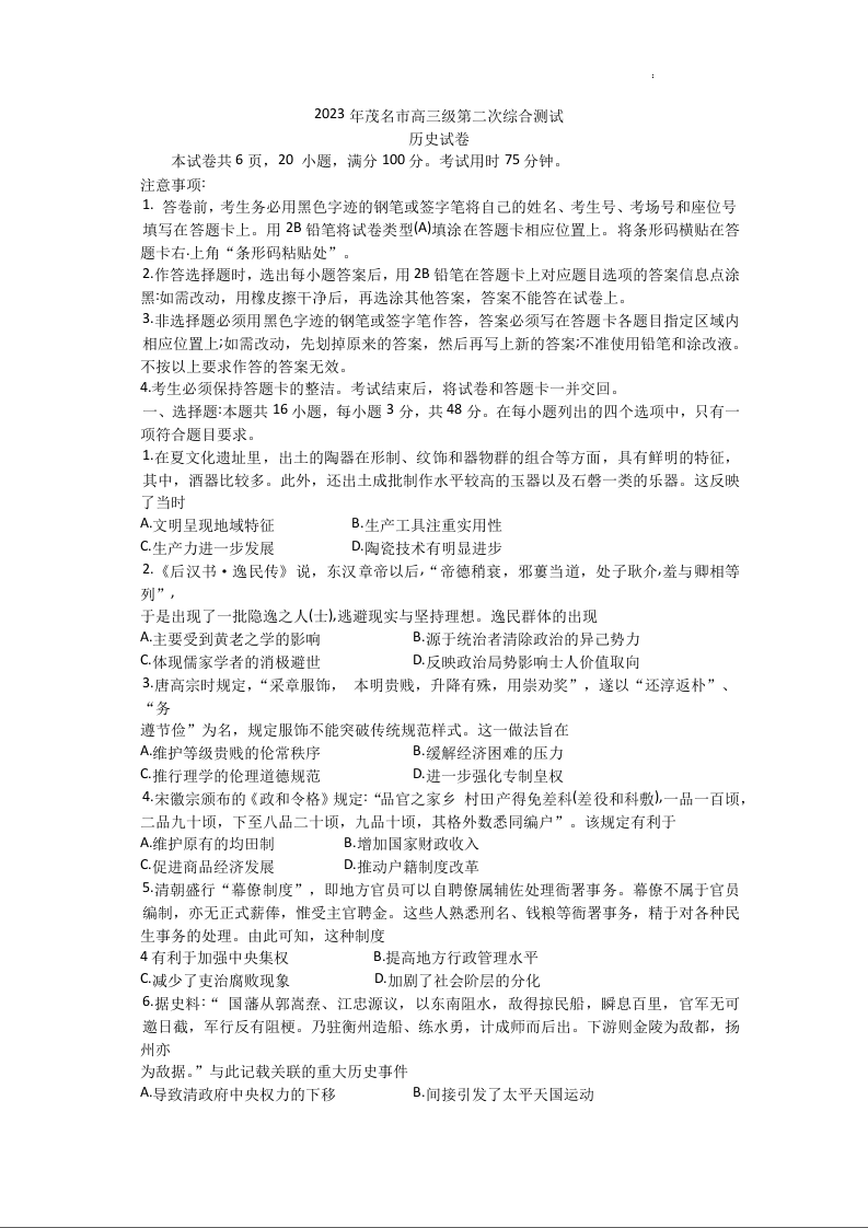 高三历史+答案--广东省茂名市2023届高三下学期第二次综合考试(二模)