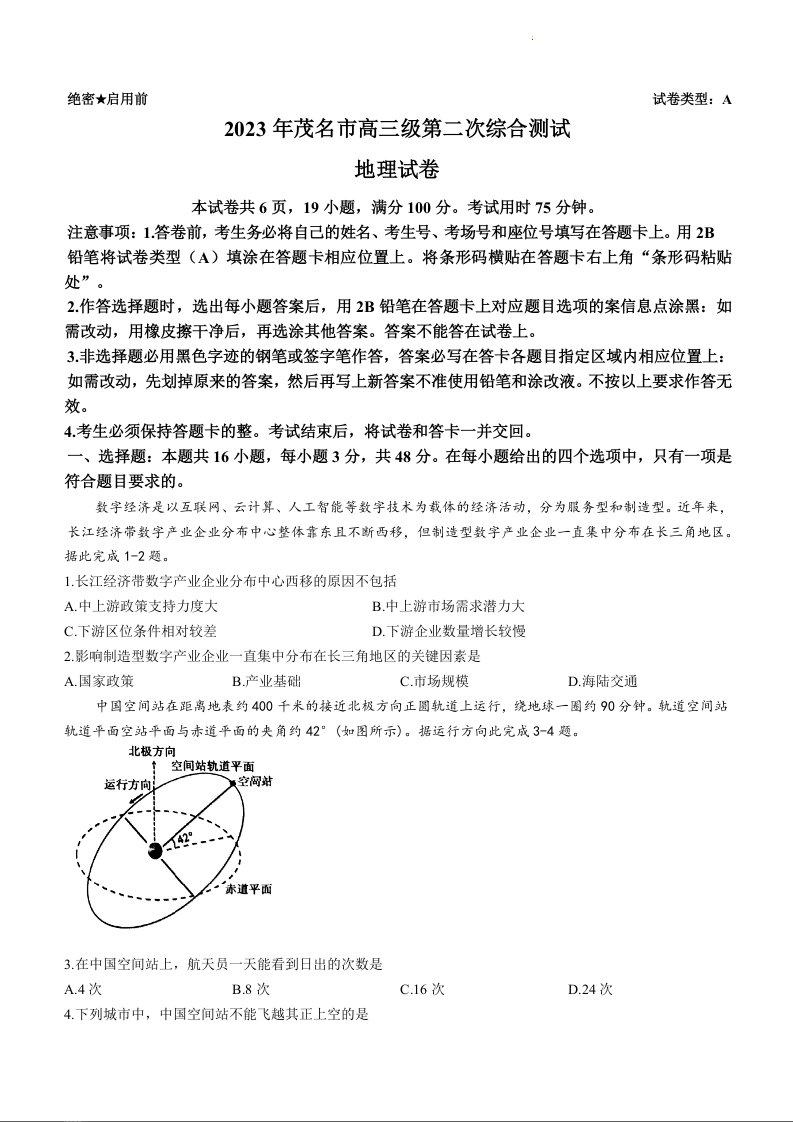 高三地理+答案--广东省茂名市2023届高三下学期第二次综合考试(二模)
