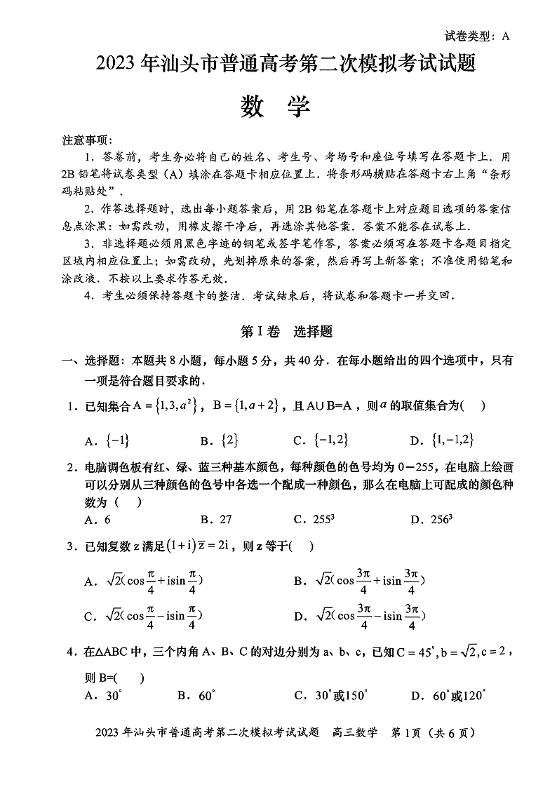 高三数学--广东省汕头市2023普通高考第二次模拟考试(汕头二模)