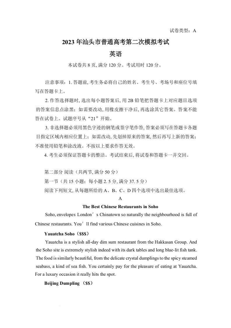 高三英语--广东省汕头市2023普通高考第二次模拟考试(汕头二模)