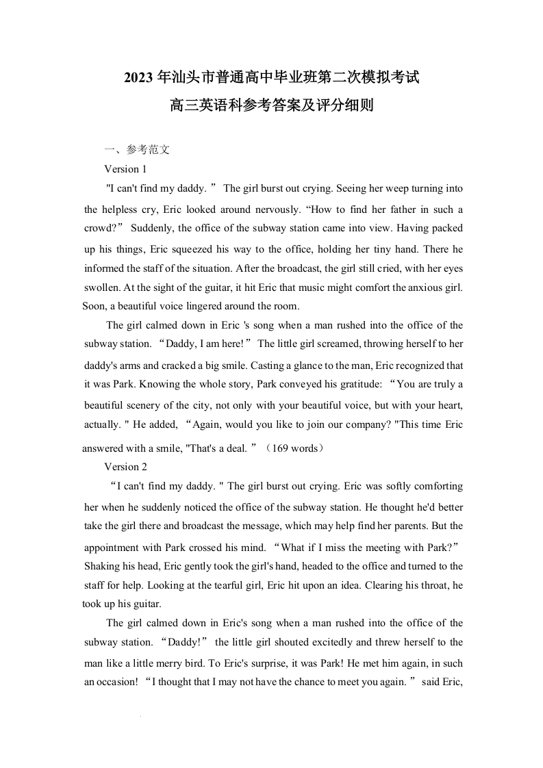 高三英语答案--广东省汕头市2023普通高考第二次模拟考试(汕头二模)