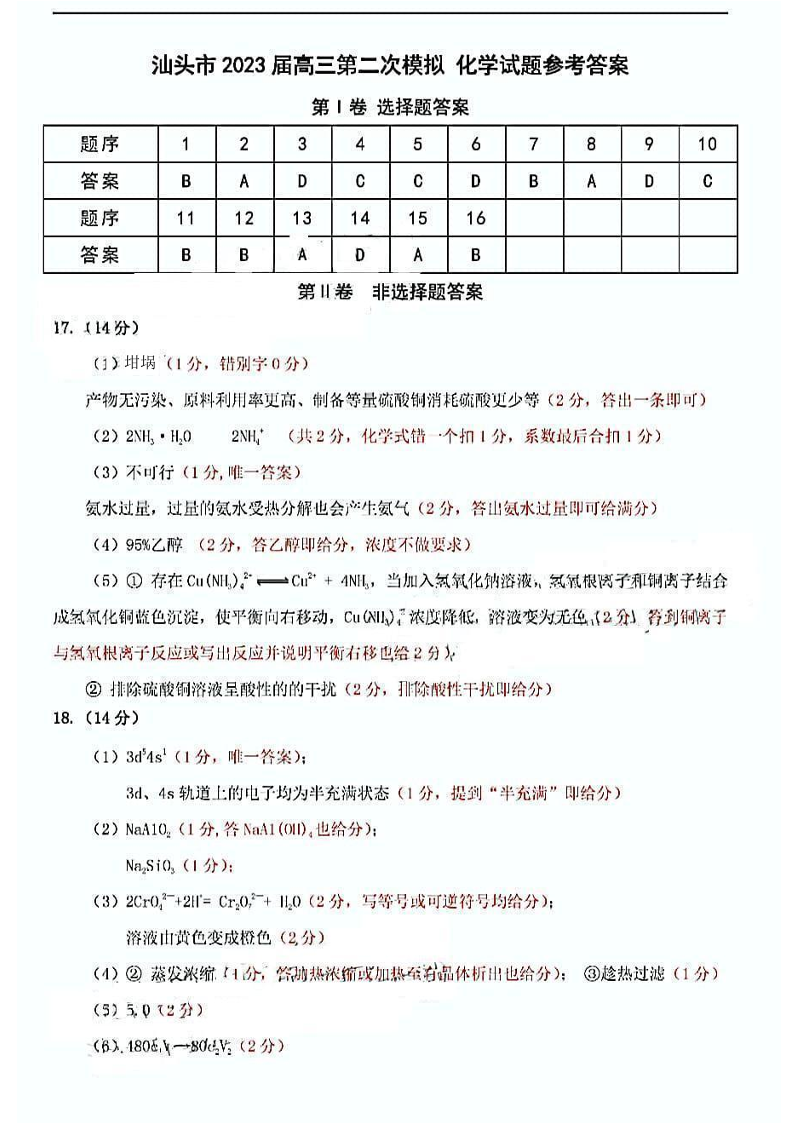 高三化学答案--广东省汕头市2023普通高考第二次模拟考试(汕头二模)