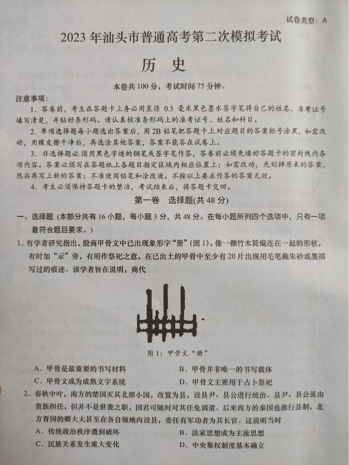 高三历史--广东省汕头市2023普通高考第二次模拟考试(汕头二模)