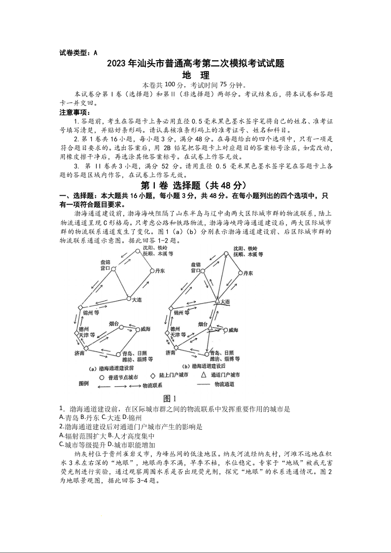 高三地理+答案--广东省汕头市2023普通高考第二次模拟考试(汕头二模)