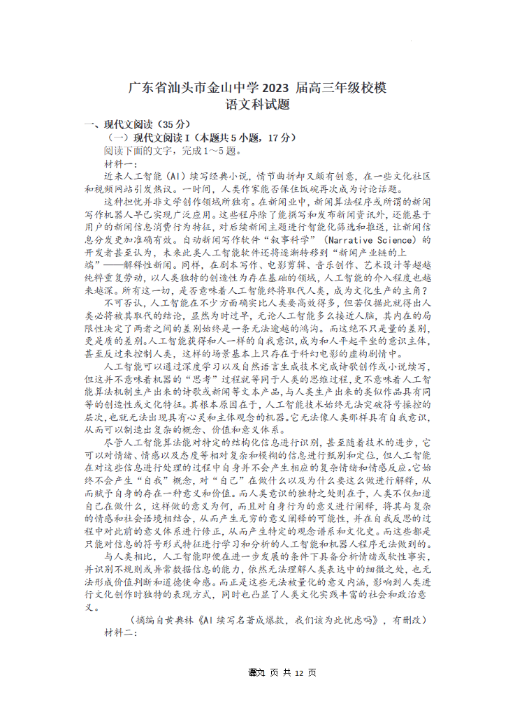 高三语文+答案--广东省汕头市金山中学2023届高三校模拟考试