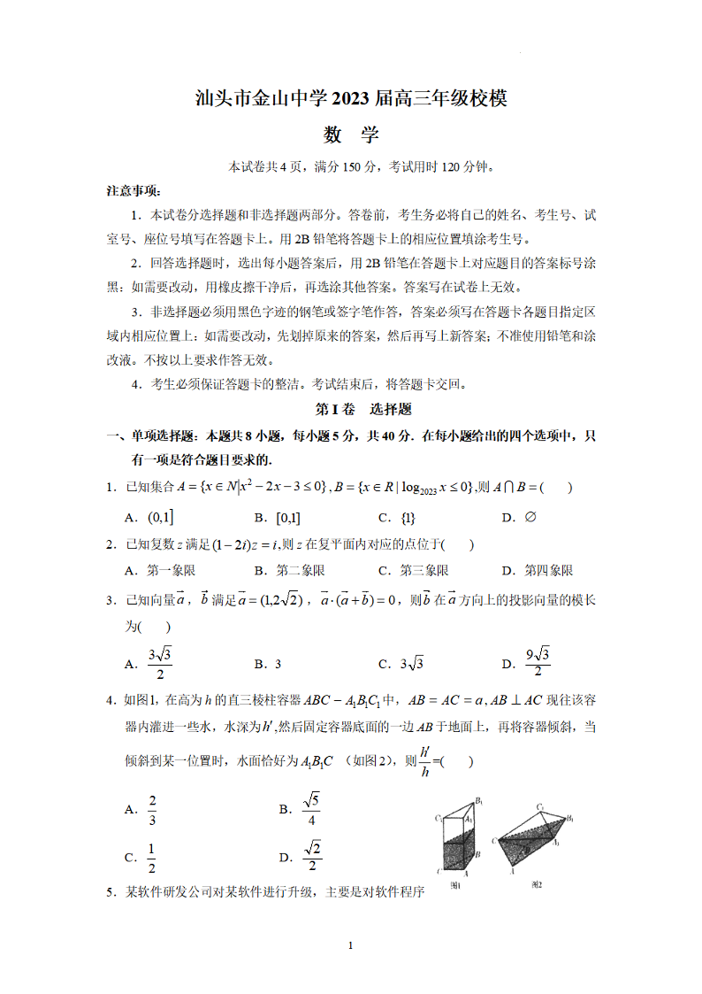 高三数学+答案--广东省汕头市金山中学2023届高三校模拟考试