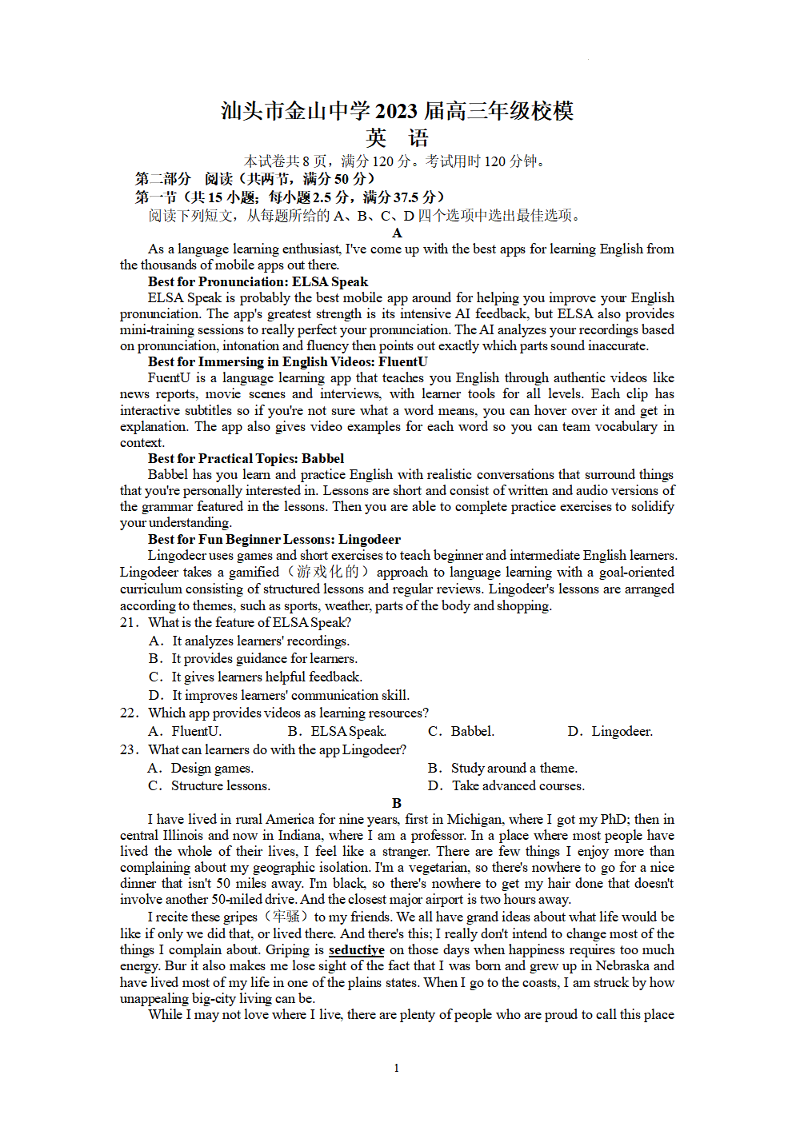 高三英语+答案--广东省汕头市金山中学2023届高三校模拟考试