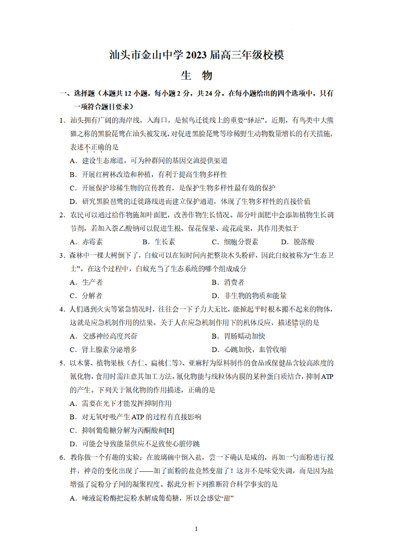 高三生物+答案--广东省汕头市金山中学2023届高三校模拟考试