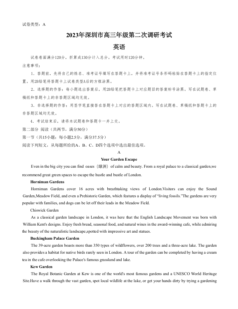 高三英语--广东省深圳市2023高三年级第二次调研考试(深圳二模)