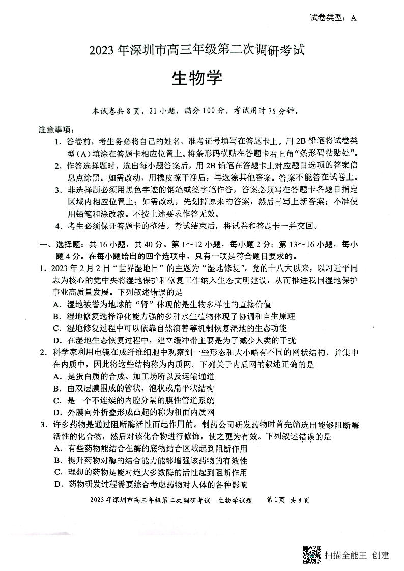 高三生物--广东省深圳市2023高三年级第二次调研考试(深圳二模)