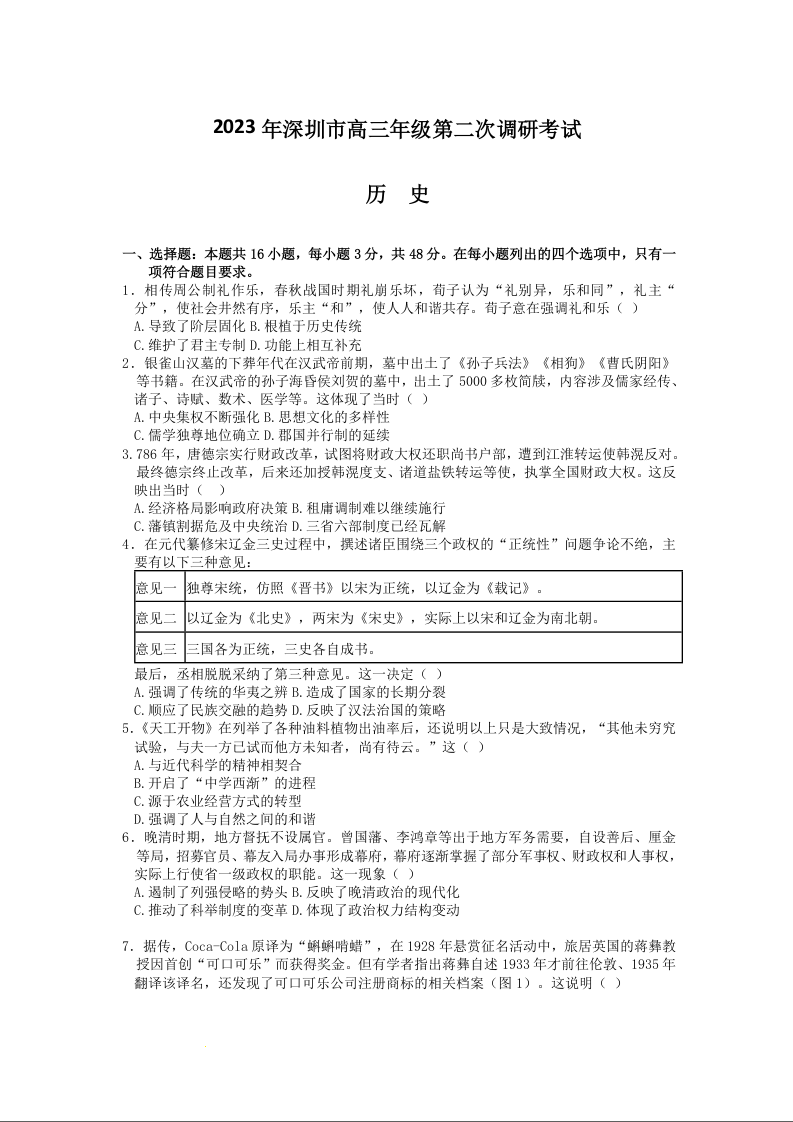 高三历史+答案--广东省深圳市2023高三年级第二次调研考试(深圳二模)