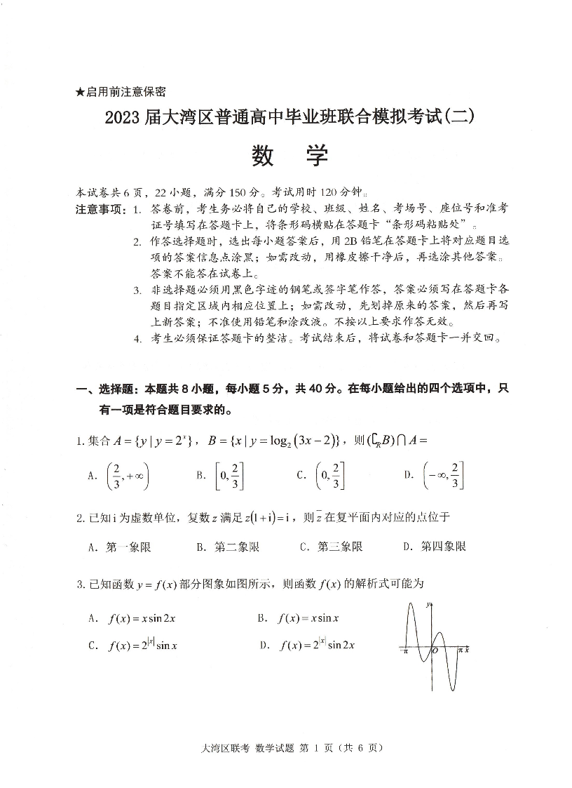 高三数学--广东省粤港澳大湾区2023普通高中毕业班联合模拟考试(二)
