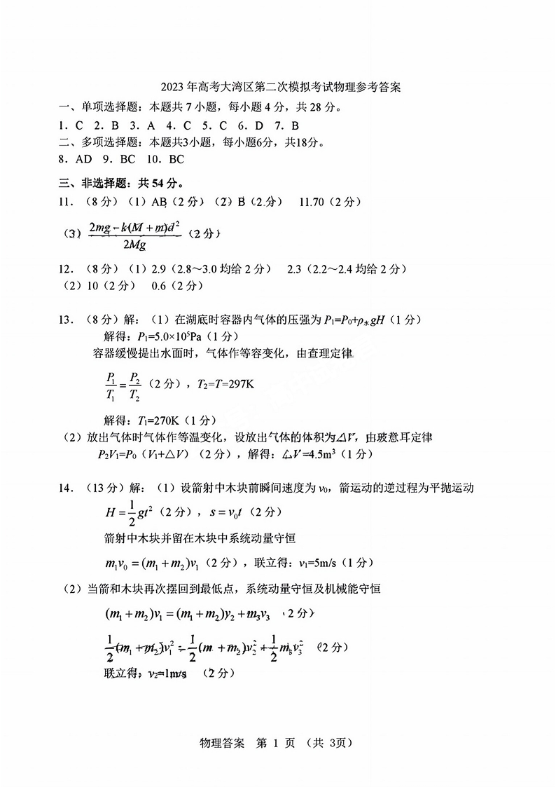 高三物理答案--广东省粤港澳大湾区2023普通高中毕业班联合模拟考试(二)
