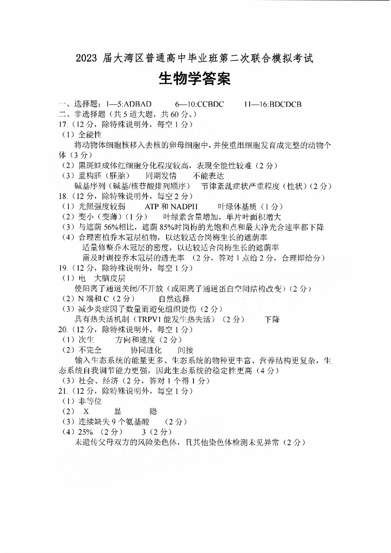 高三生物答案--广东省粤港澳大湾区2023普通高中毕业班联合模拟考试(二)