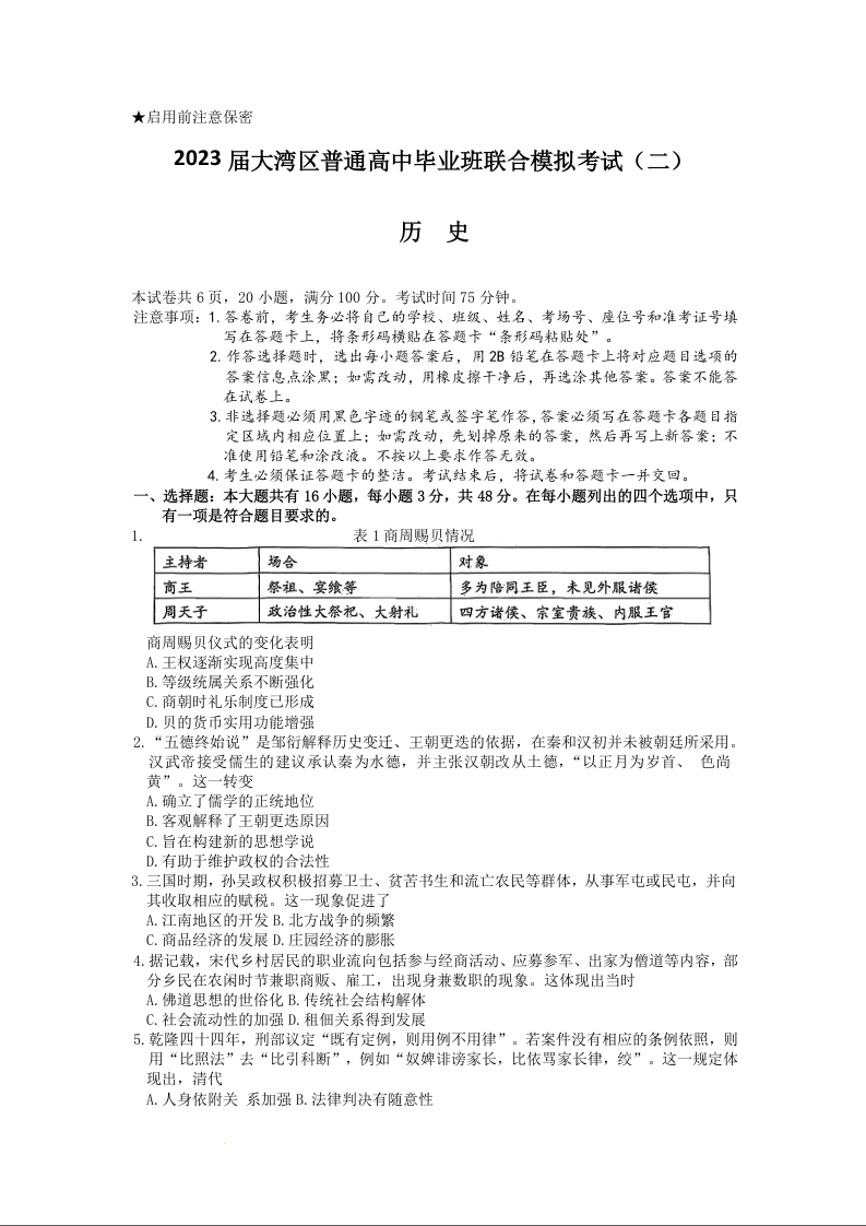 高三历史--广东省粤港澳大湾区2023普通高中毕业班联合模拟考试(二)