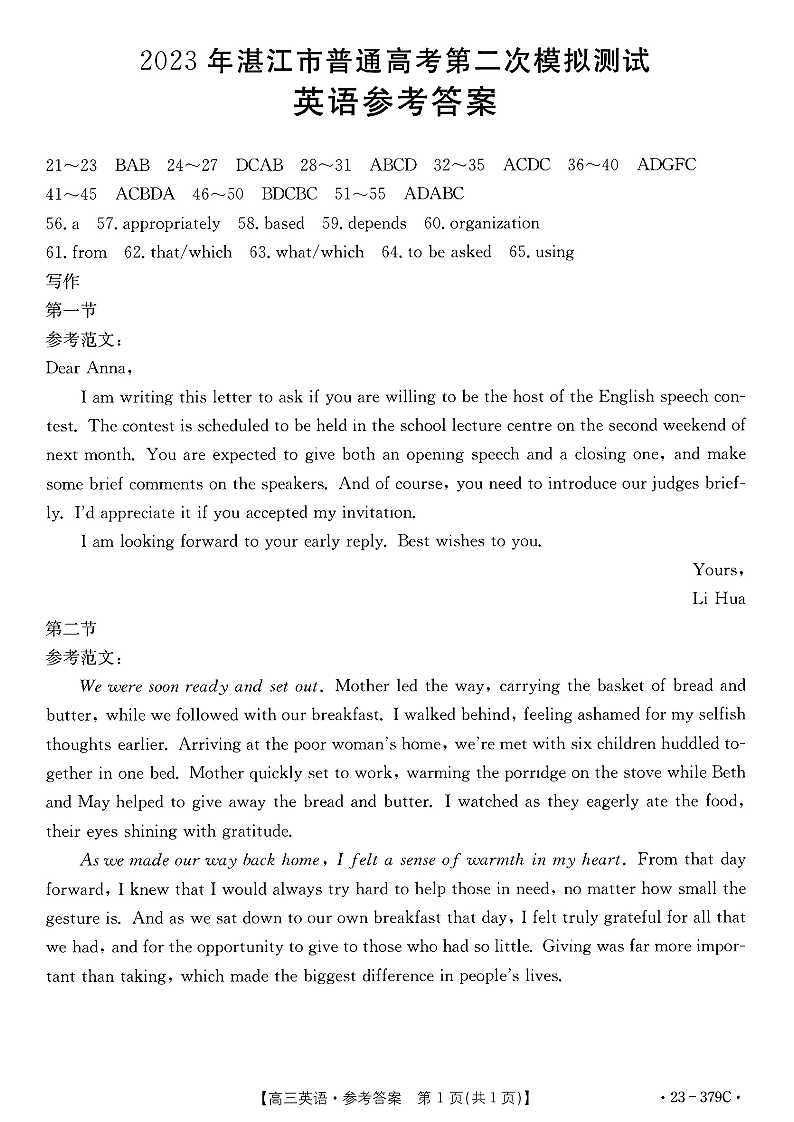 高三英语答案--广东省湛江市2023届高考二模(23-379C)(湛江二模)