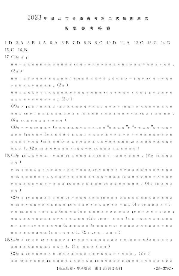高三历史答案--广东省湛江市2023届高考二模(23-379C)(湛江二模)