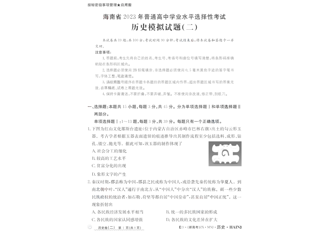 高三历史+答案--海南省2023届高三下学期普通高中学业水平选择性模拟考试(二)
