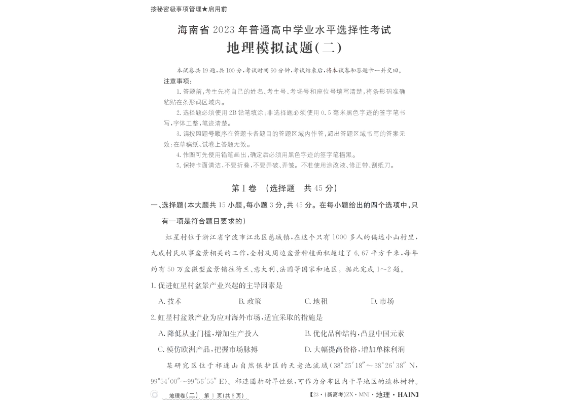 高三地理+答案--海南省2023届高三下学期普通高中学业水平选择性模拟考试(二)