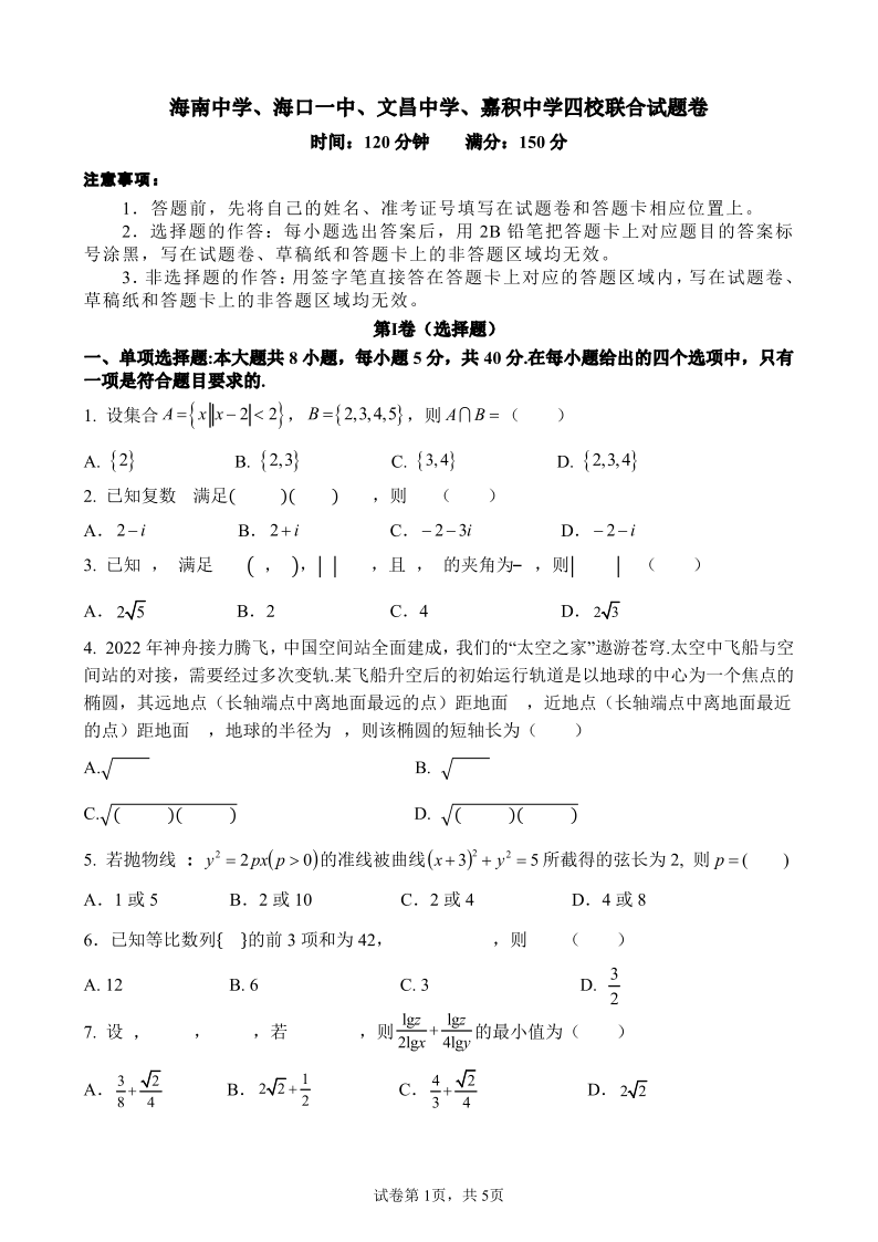 高三数学--海南省海南中学、海口一中、文昌中学、嘉积中学四校2023届高三下学期4月联考