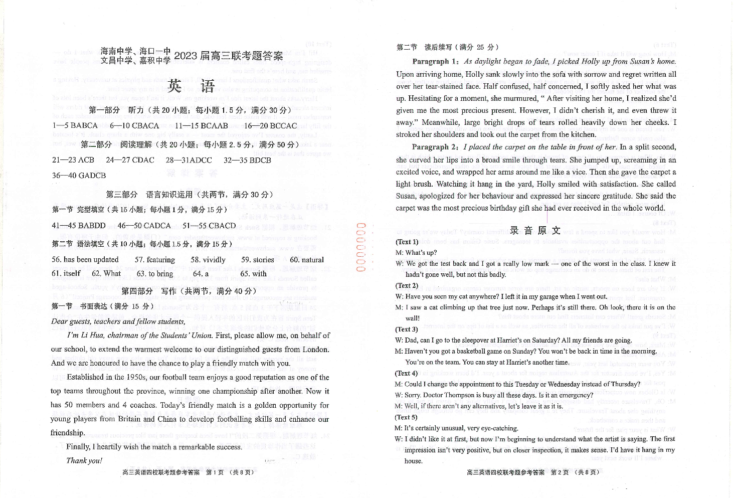 高三英语答案--海南省海南中学、海口一中、文昌中学、嘉积中学四校2023届高三下学期4月联考