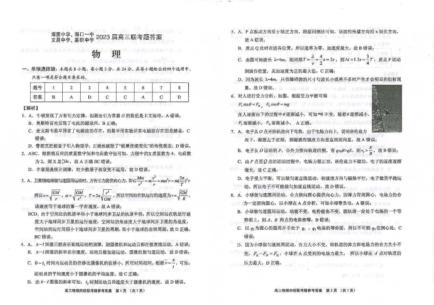 高三物理答案--海南省海南中学、海口一中、文昌中学、嘉积中学四校2023届高三下学期4月联考