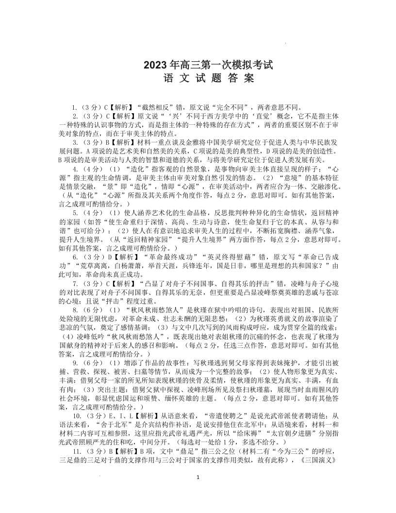 高三语文答案--河北保定2023年高三第一次模拟考试(保定一模)