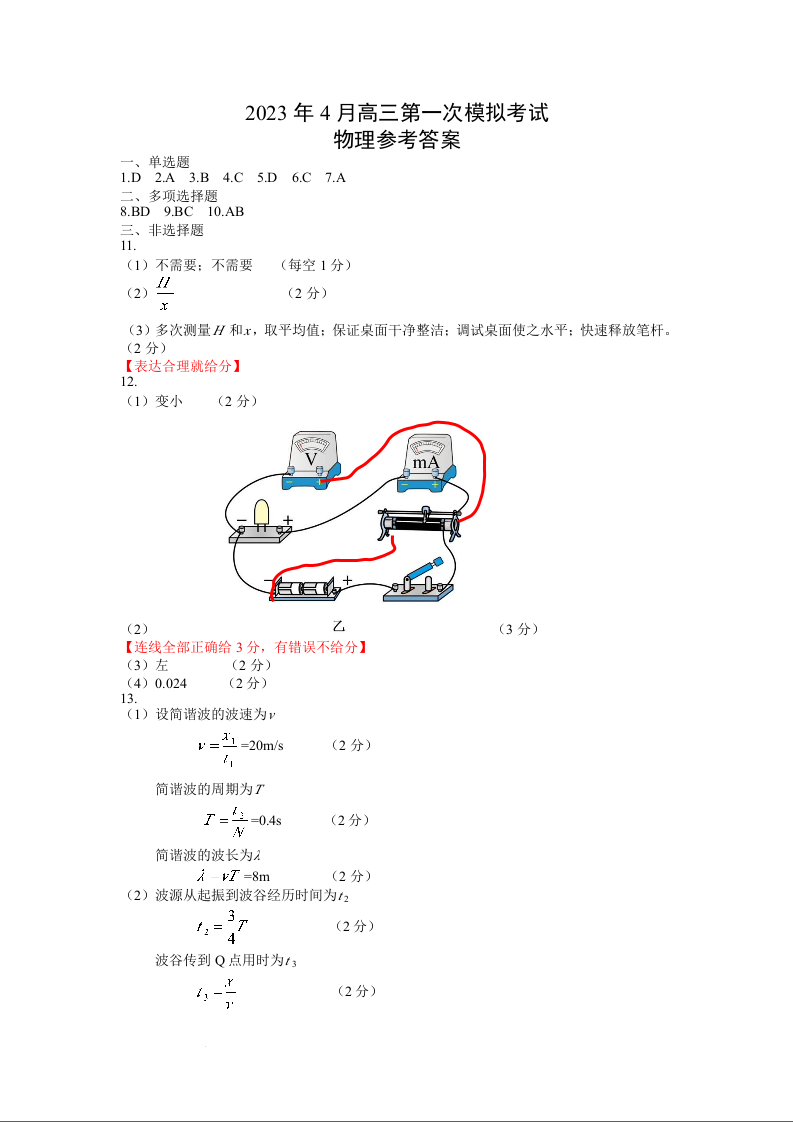高三物理答案--河北保定2023年高三第一次模拟考试(保定一模)