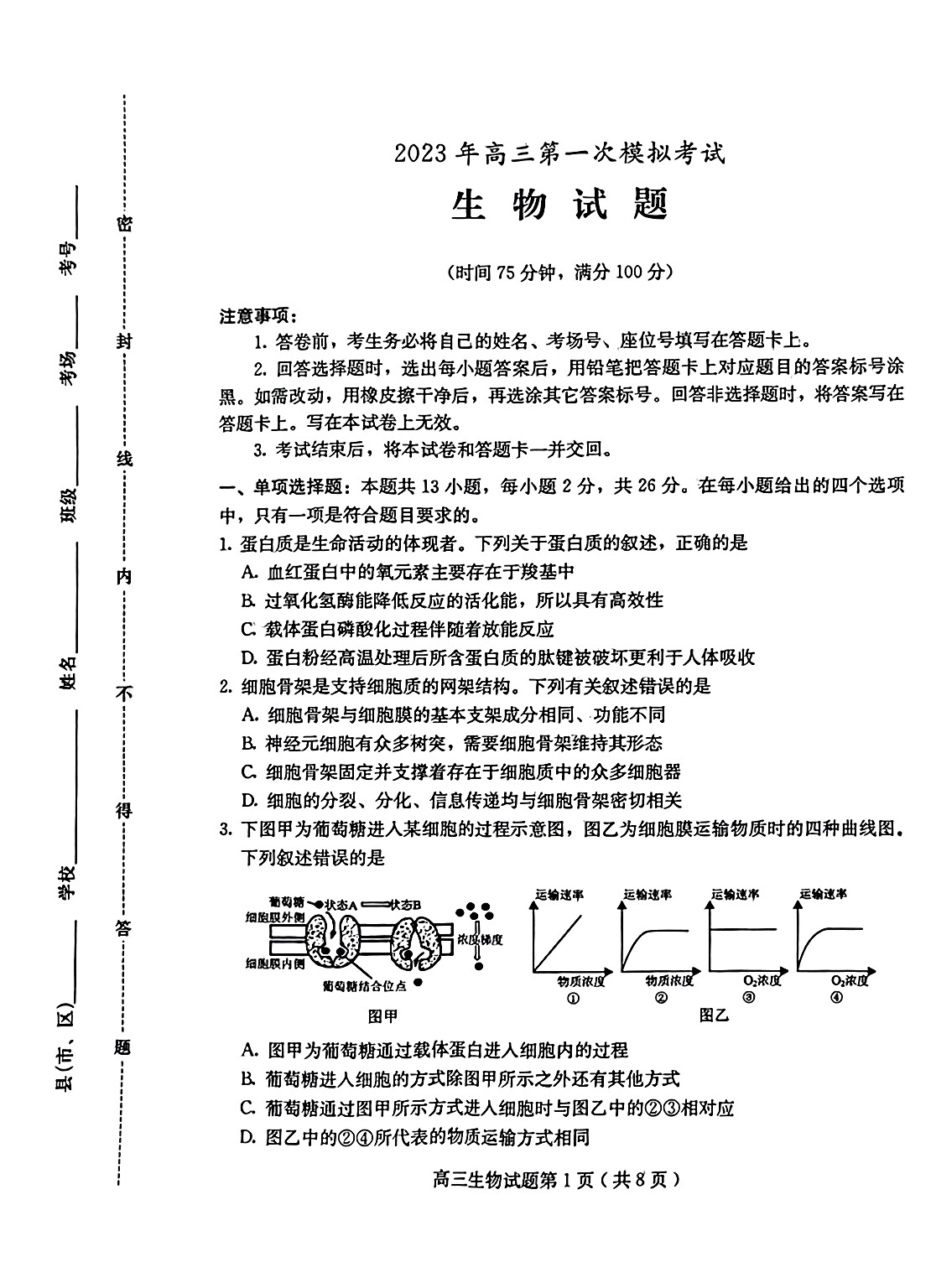 高三生物--河北保定2023年高三第一次模拟考试(保定一模)