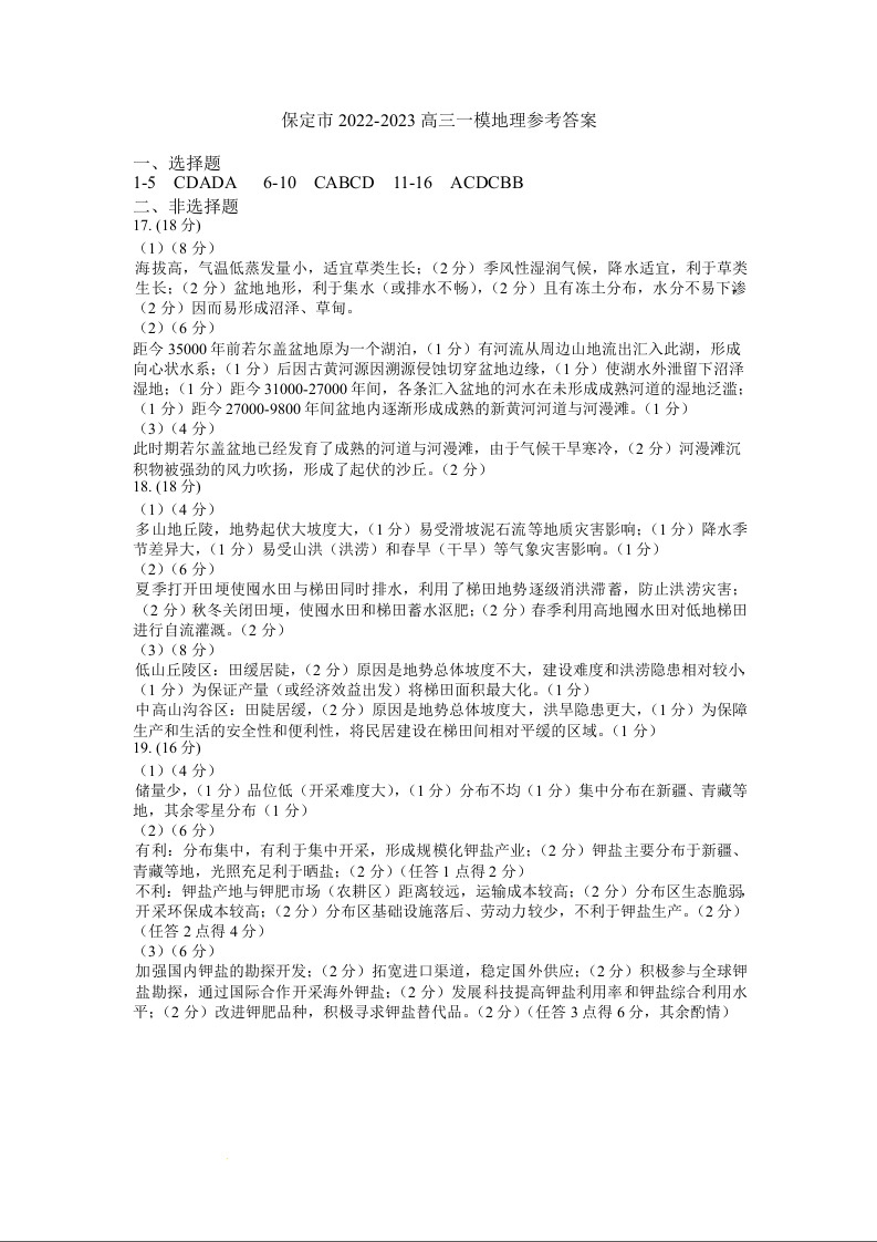 高三地理答案--河北保定2023年高三第一次模拟考试(保定一模)