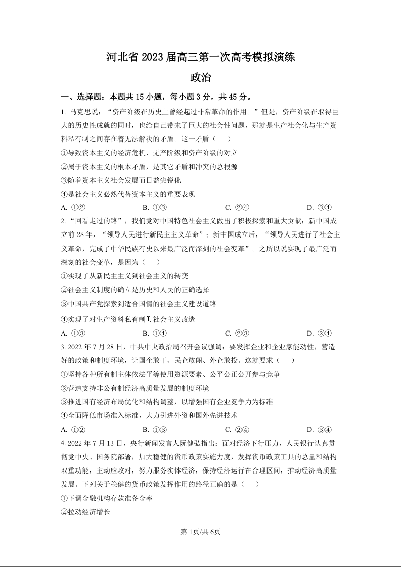 高三政治(原卷版)--河北省2023高三第一次高考模拟演练