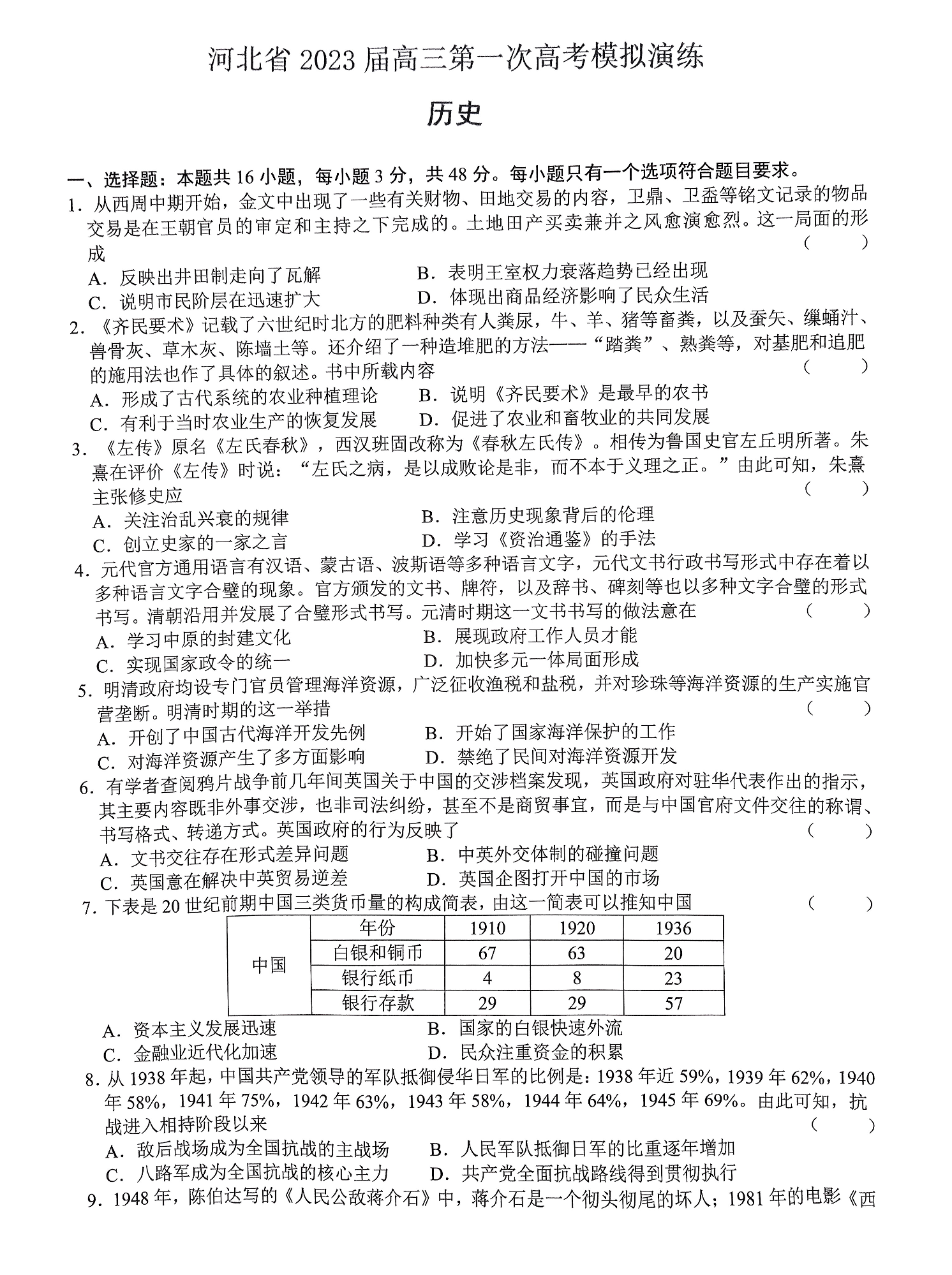 高三历史--河北省2023高三第一次高考模拟演练