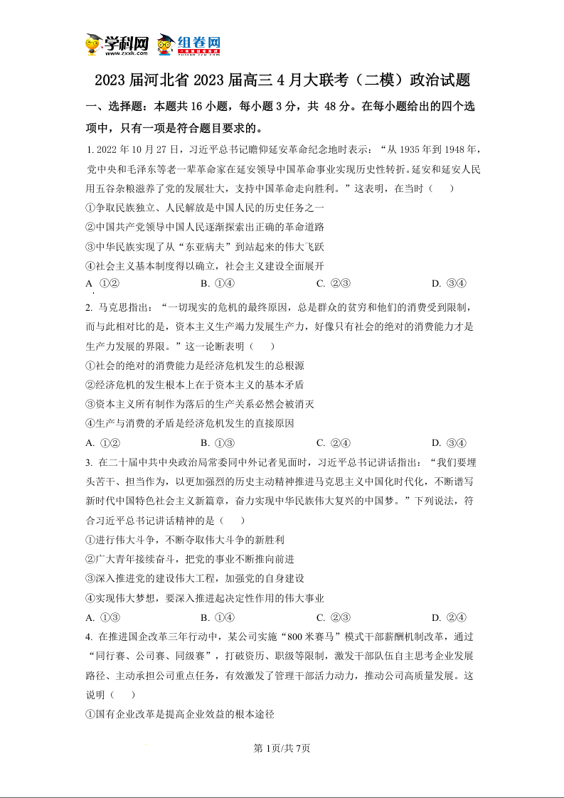 高三政治(原卷版)--河北省2023高三下学期4月大联考(二模)