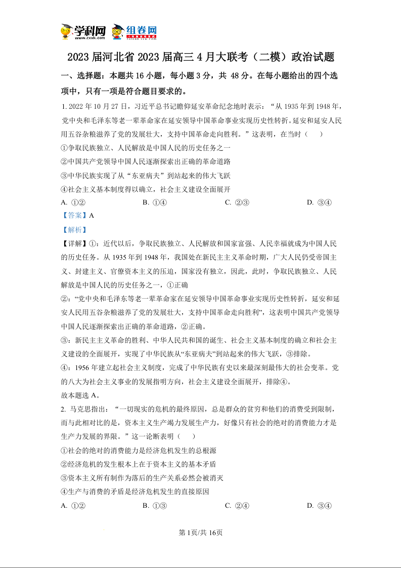 高三政治(精品解析版)--河北省2023高三下学期4月大联考(二模)