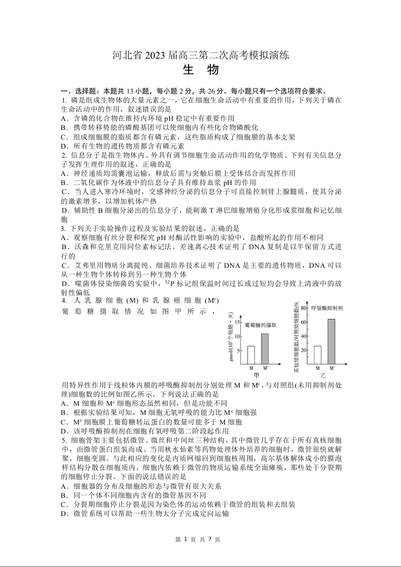 高三生物--河北省2023届高三第二次高考模拟演练(河北二模)