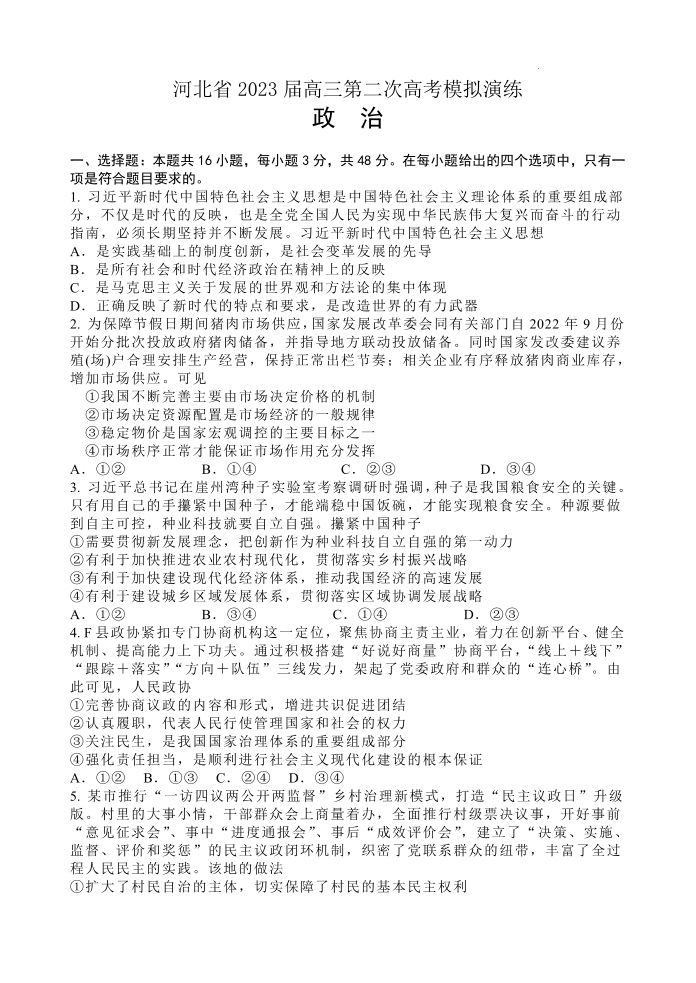 高三政治--河北省2023届高三第二次高考模拟演练(河北二模)