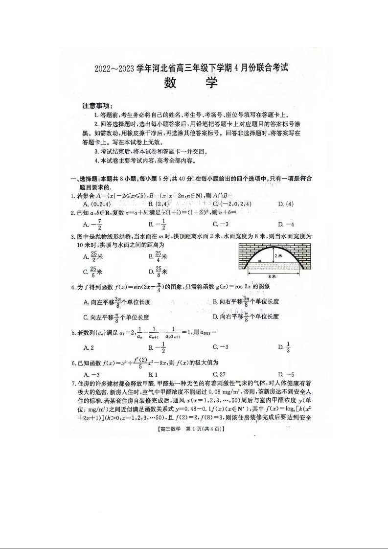 高三数学+答案--河北省2023下学期高三4月联考