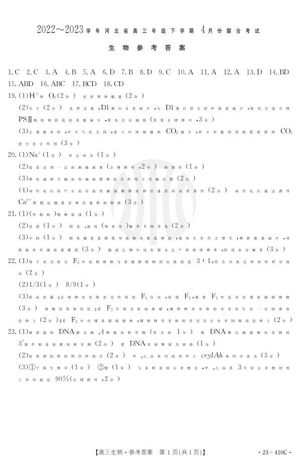 高三生物答案--河北省2023下学期高三4月联考