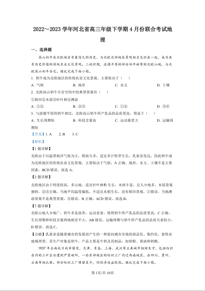 高三地理(精品解析版)--河北省2023下学期高三4月联考