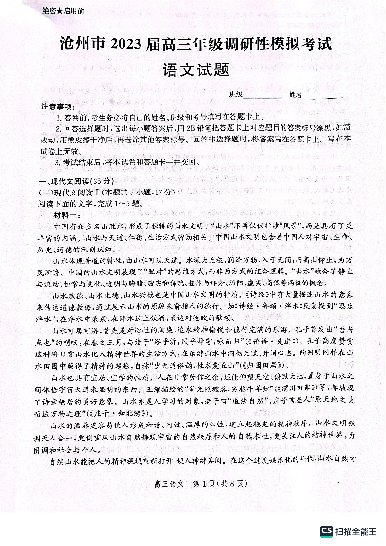 高三语文--河北省沧州市2023届高三调研性模拟考试(一模)