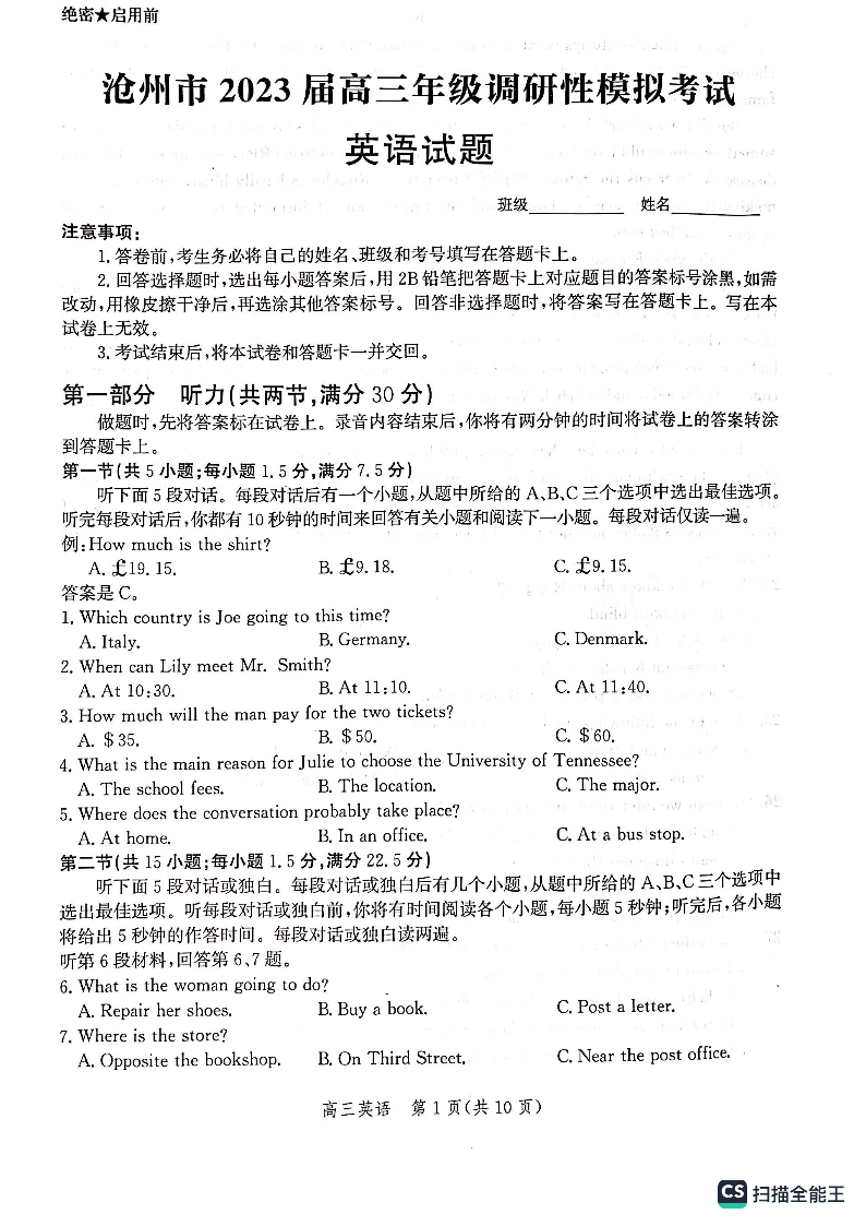 高三英语--河北省沧州市2023届高三调研性模拟考试(一模)