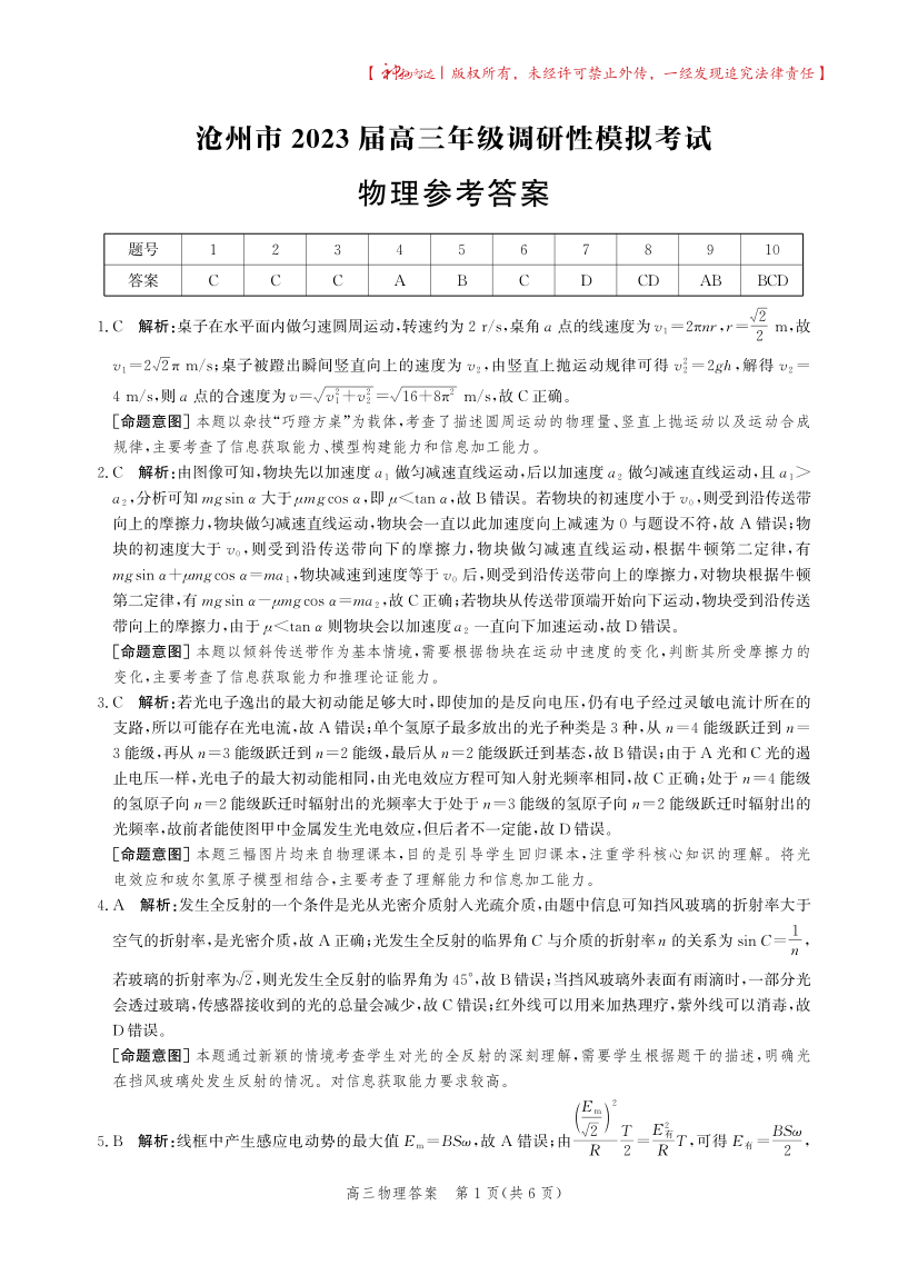 高三物理答案--河北省沧州市2023届高三调研性模拟考试(一模)