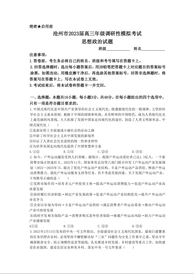 高三政治--河北省沧州市2023届高三调研性模拟考试(一模)